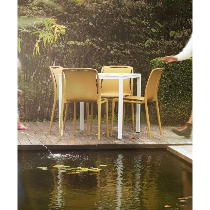 Velair è realizzata con una combinazione di materiali riciclati postconsumo e fibra di vetro, una scelta che riduce l’impatto ambientale senza rinunciare a prestazioni elevate. Il risultato è una sedia resistente agli agenti atmosferici, leggera e durevole, perfetta anche per terrazze e dehor protetti.